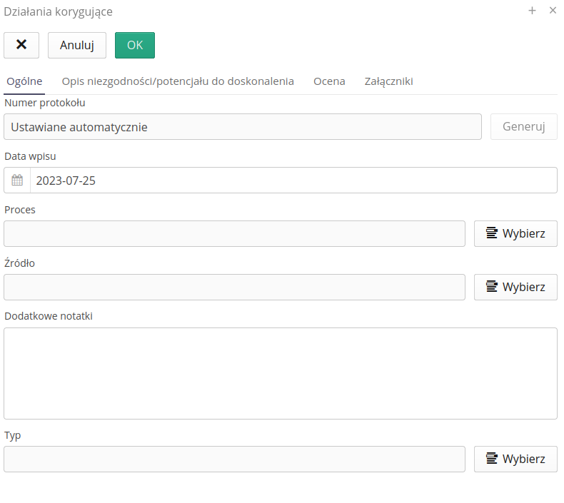 Utworzenie nowego rejestru działań Korekcyjnych/Korygujących