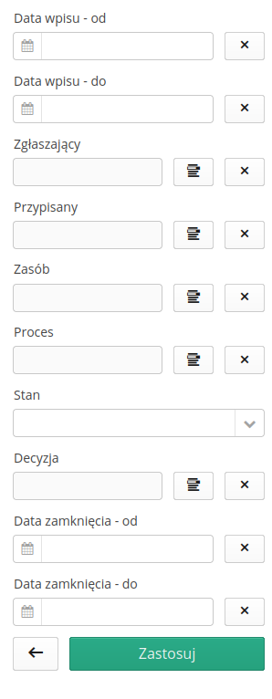 Widok podstawowy przedstawia listę wszystkich zdarzeń. Za pomocą dedykowanych przycisków możemy wybrać rejestry utworzone przez aktualnego użytkownika lub do niego przypisane.